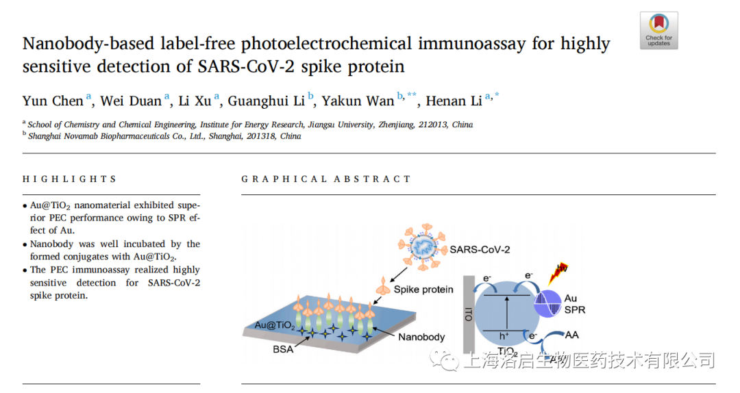 2022年5月3日,金拉霸网站生物和江苏大学化学化工学院李赫楠教授团队合作,在《Analytica Chimica Acta》发表了题为“Nanobody-based label-free photoelectrochemical immunoassay for highly sensitive detection of SARS-CoV-2 spike protein”的研究论文。金拉霸网站生物万亚坤博士和李贺楠教授为并列通讯作者,相关纳米抗体的知识产权归金拉霸网站生物所有。